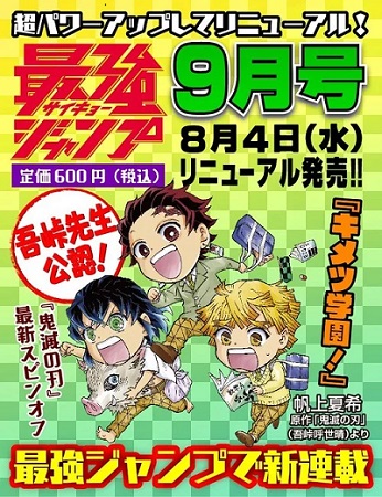 The new manga, titled Kimetsu Gakuen!, will debut in the September issue of Shueisha’s Saikyo Jump magazine on 4 August.