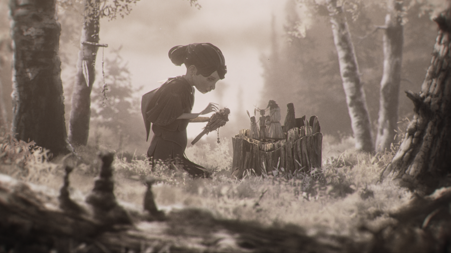 Gies experimented with several looks for the characters, creating both physical paper puppets and CG counterparts for each iteration. For the siblings, he elected to remove the faces entirely, both in reference to indigenous doll-making practices in the area, and the fact that the protagonist can no longer recollect what they look like. Instead, she remembers their personalities, which are reflected by animalistic touches like the timidness of the youngest sister embodied by a rabbit, the independence of the brother translated as a fox and the cautious trepidation of another sister, presented as a deer. The design of the bird-like mother, however, was meant to show that she was a creature trapped between two worlds.