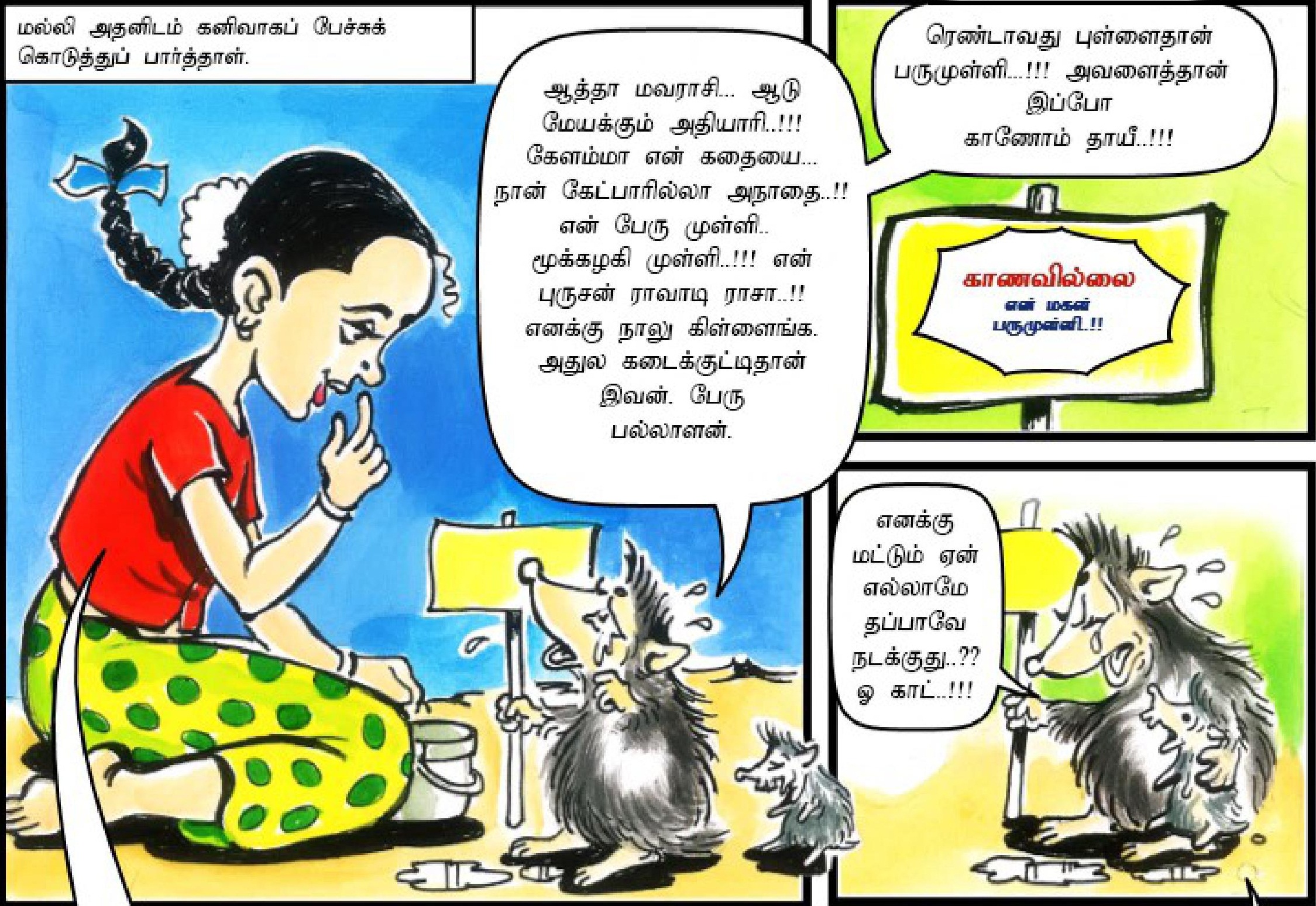 Elaborating on the creative process and challenges faced, Babu explained, “After receiving the inputs from Kumar I examined every narrative to create an attractive storyline. We chose a female character as the protagonist to make the character reach a wide audience. The female character Malli, is named after my mother, as I thought it would sentimentally work out for my first comic. During that time Indian lyricist Vairamuthu released his book Kallikattu Ithikasam (The epic of Kallikkadu), and we got inspired by that title and named our comic book Mullikkaattu Ithigaasam. From here we started to sketch our stories and creative panels.”