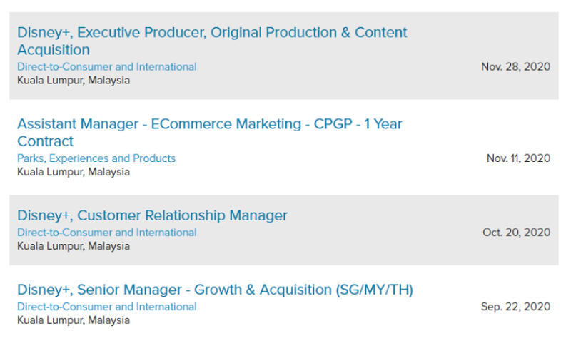 The fan site also reported that Disney has been looking for candidates for several Kuala Lumpur-based job vacancies, including customer relationship manager and executive producer for original production and content acquisition.