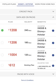 Rs. 1208 Plan: This plan offers a validity of 240 days which is 8 cycles of 30 days. The total data being offered is 240 GB (30 GB/month)+ one year of Disney+ Hotstar VIP subscription worth Rs. 399, and complimentary Jio apps.