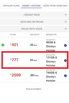Rs. 777 Plan: This plan comes with 131 GB data (1.5GB of 4G data per day+ 5 GB) + Unlimited Jio to Jio calls, 3000 minutes of Jio to Non-Jio calls, one year of Disney+ Hotstar VIP subscription worth Rs. 399, and complimentary Jio apps for 84 days.