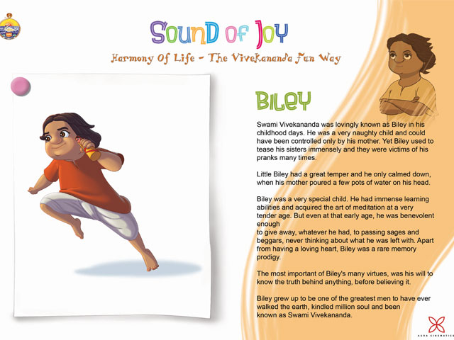 Targeted at kids aged between 5-11 years, this 52 minutes film, tells the story of modern day kids, struggling with their aspirations and expectations and how they get inspired by stories of Biley (Childhood name of Swami Vivekananda), who during his childhood was as naughty and spirited as any kid of these days, and how these stories, help and motivate them to fight any crisis, difficult situations.