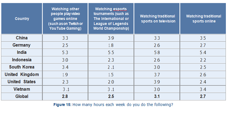 - People who play video games are watching traditional sports, both online and on traditional broadcast TV at similar hours per week. Respondents’ time spent watching video game play is up by 27 per cent compared to last year. Time spent watching traditional sports online is up by 34 per cent and watching sports on TV has increased by 30 per cent. India stands out across all these activities with over five hours per week spent on watching other people play games across aforementioned verticals.