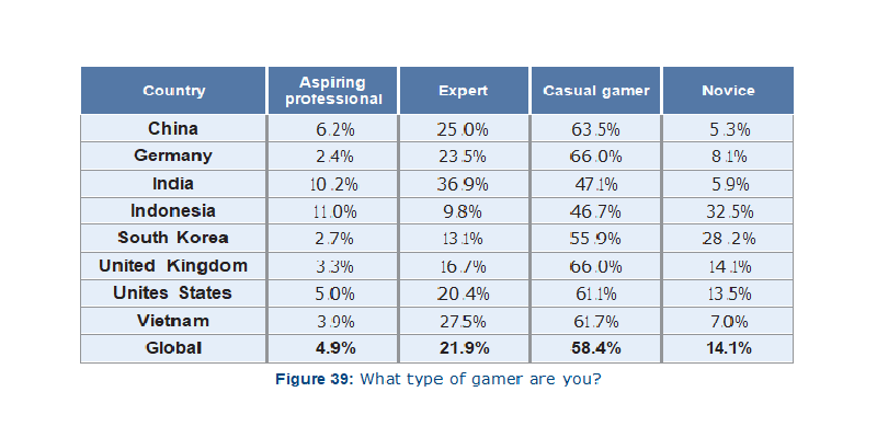 - Most gamers put themselves in the casual player category. A higher percentage of gamers in Indonesia rank themselves as aspiring professionals than any other country, yet the lowest percentages of expert and casual gamers, and the highest percentage of novices .