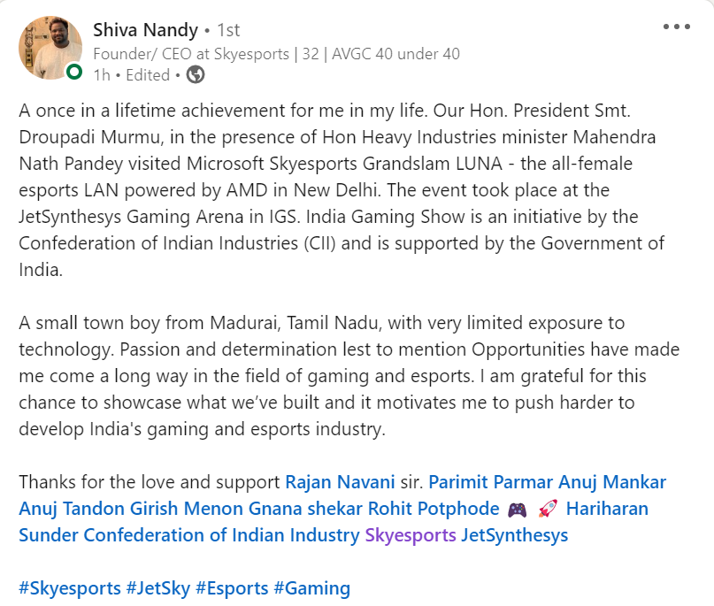 Here is the official post by Skyesports founder and CEO Shiva Nandy-