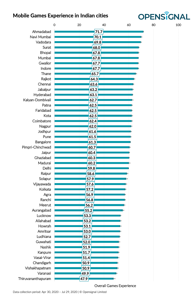Opensignal analyzed the mobile network experience in 48 of India’s largest cities to see how they stacked up on the Games Experience metric. It measures how users perceive real-time multiplayer mobile gaming on cellular networks (on a scale of 0-100) across some of the most popular genres such as Battle Royale and MOBA games, of which COD, PUBG and Clash Royale are examples. The report states, “We found that cities in the states of Gujarat and Maharashtra dominated our measure of mobile gaming experience in India — seven of the top ten cities hail from either of the states. The best Games Experience was enjoyed by our users in Gujarat’s metro city of Ahmedabad with a score of 71.7, followed by Navi Mumbai (70.1) and Vadodara (69.8). It was noteworthy that Ahmedabad and Mumbai were the only Tier 1 cities that placed in the top ten cities, along with Tier 2 and Tier 3 cities like Surat, Thane, and Rajkot.”
