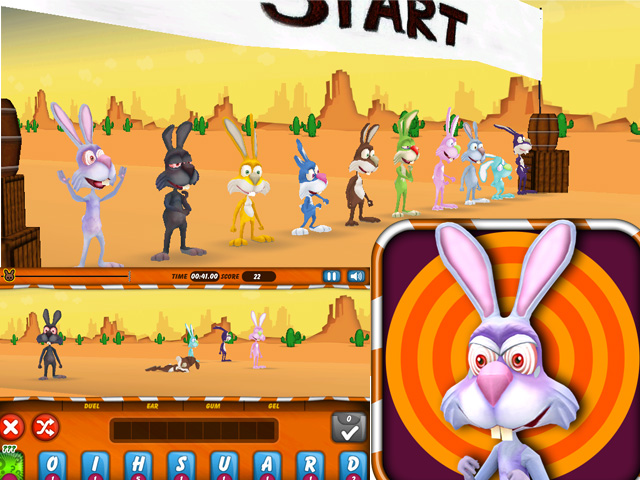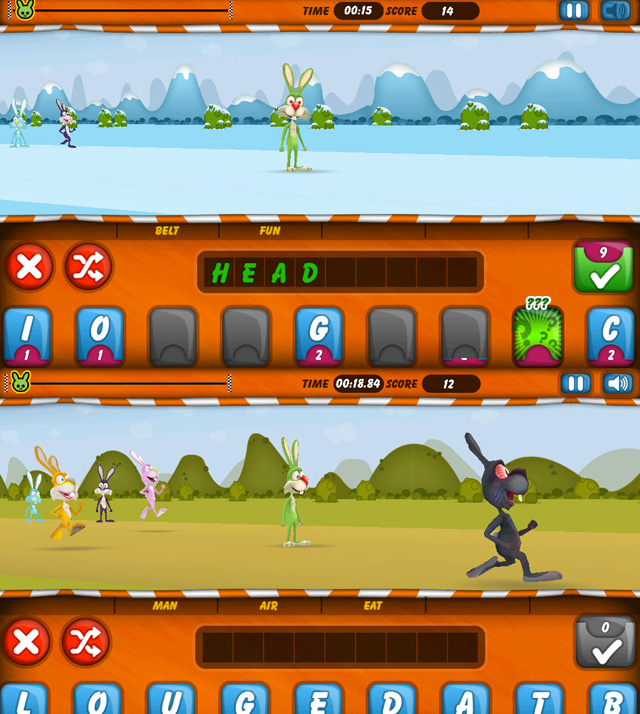 Bugs Bunny was the principle inspiration for designing the different bunny characters for this game. The game play consists of a racing bunny fueled by words created by the player. As words are fuel in this game, the quicker the player forms maximum words with the deck of letter, the faster the rabbit runs.