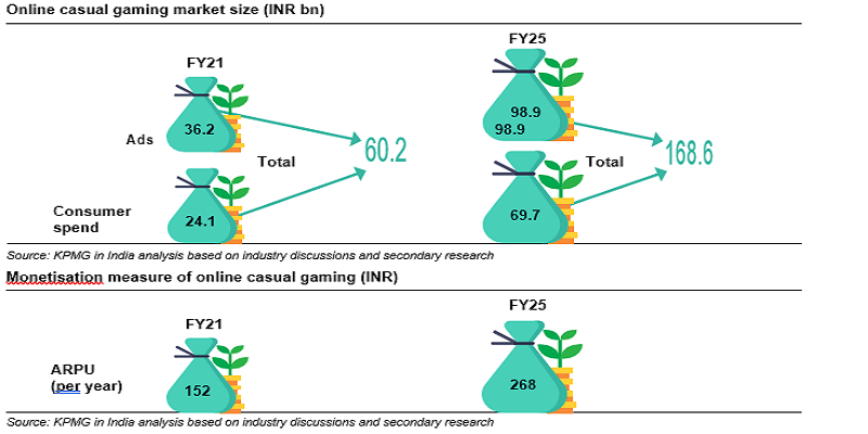 The Indian online gaming market has seen an incredible growth not just in the number of gamers but also in user engagement levels. According to the recent KPMG report Beyond the tipping point – A primer on online casual gaming in India, from ~250 mn gamers at the end of FY18, the numbers of gamers in India grew to ~400 mn by the mid of FY20, the second largest base of online gamers in the world after China. Online casual gaming sub-segment in India stood at a size of Rs 60 billion in FY21 and is projected to grow at a CAGR of 29 per cent over FY21-25 to reach a size of Rs 169 billion.
