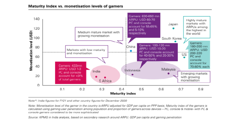 - With India’s movement up this maturity curve, the monetisation and as a result, ARPUs are likely to increase significantly on the back of increased user penetration with young gamers adopting gaming, rising disposable incomes, increased propensity to spend on gaming as a form of entertainment and higher time spent on gaming.