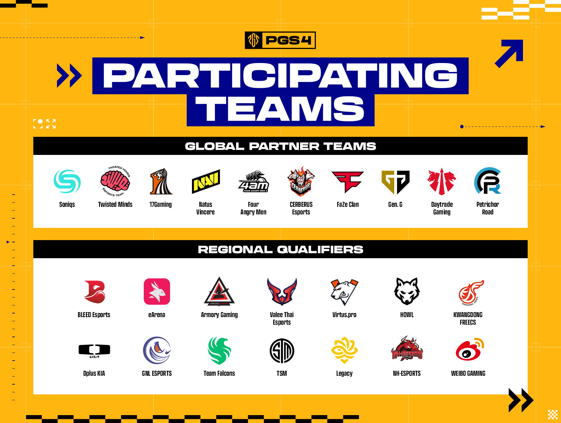A mix of 10 Global Partner teams and 14 top teams from the previous tournament will advance into the PGS 4 tournament. The full list of participating teams are: