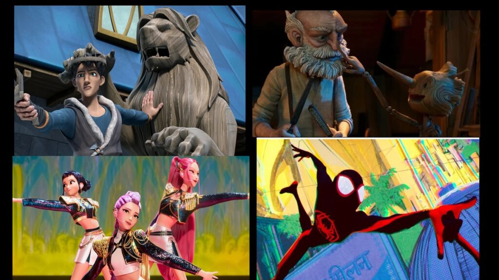 Bottom Left to Bottom Right (Clockwise): KPop Demon Hunters (2025), Wolf King, Guillermo del Toro’s Pinocchio and Spider-Man: Across the Spider-Verse