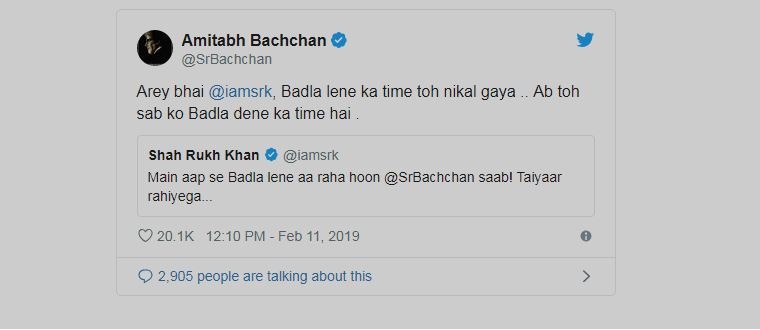 Khan tweeted, “Main aap se Badla lene aa raha hoon @SrBachchan saab! Taiyaar rahiyega…” To which, Bacchan replied, “Arey bhai @iamsrk, Badla lene ka time toh nikal gaya .. Ab toh sab ko Badla dene ka time hai.”