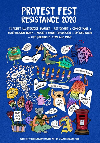 Hosted by illustrator, Madhuvanthi Mohan (@somethingsketchy), Protest Fest is organised under the banner of an illustrators’ group called The Sketchup (@thesketchup), run by Mohan, where she brings the artist community together for intimate gatherings as well as larger art shows. Said she why such events are the need of the hour, “So much amazing protest art has come out of the Indian artist community lately, and this was a great way to bring it all together and showcase it. We are a free country after all and we have a right to share our opinions even if the government may not agree, that’s what a democracy is. It’s also a way to gather like minded folk together, to find strength in each other and keep our mental peace while continuing to stand up for what we believe is fair and right.”