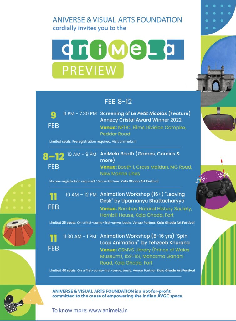 AniMela Festival is tentatively scheduled for November-December 2023. The Festival will be launched on 9 February 2023. Please refer to the image to know more about the public events in February. To know more about AniMela and the Aniverse & Visual Arts Foundation, subscribe to animela.in. Follow them on Instagram and Facebook @animelaindia. Write to them at animelaindia@gmail.com.