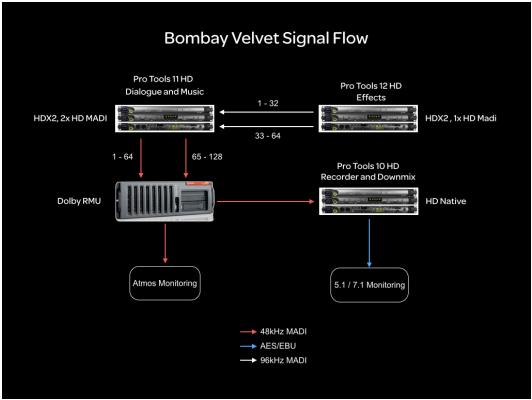 They are running the dialogue and music on a Pro Tools HDX2 System with 2 HD MADI IO and Version 11.3.1. The Effects, Foley and Ambience is running from another Pro Tools HDX2 system and 1 HD MADI IO with Version 12. And there is a third system which is an HD Native system with Pro Tools 10.3.9 that is used for recording the Mixdowns. All of these systems receive clock from a Rosendahl Clock generator.