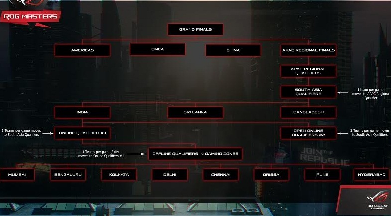 New Delhi, 30 June, 2017 — ASUS Republic of Gamers (ROG) today announced that the ROG Masters 2017 – India & South Asia qualifiers and the finals will be hosted at The Lalit, Bengaluru on 19 August 2017. The registrations will start from today at their website. Hosted for 2 games; Counter Strike: Global Offensive & Dota2, the tournament is divided into 4 continents – (APAC) Asia Pacific, Americas, China & EMEA (Europe, the Middle East, and Africa). India, Bangladesh, and Sri-Lanka form the South-Asia group under APAC. The India qualifier is divided into two segments – Offline India Qualifier (Qualifier #1) & India Open Online(Qualifier #2). The offline qualifier will have a total of 16 cafes (List appended below) across 8 cities that will host the tournament from 8 July to 25 July, 2017. Post this, there will be India Online Open (Qualifier #2) scheduled to commence from 27 July 2017. The South-Asia finale will be hosted in Bengaluru at The Lalit on 19-20 August with an attractive prize pool of INR 10,00,000. The total tournament prize money for both the games is INR 32,000,000.