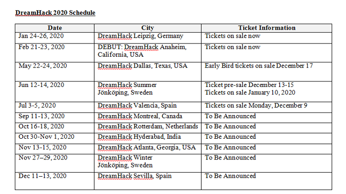 ‘DreamHack Day’ always offers a time to reflect on the company’s past, present and future, but it also is a day to officially announce the 2020 world tour schedule. In 2020, DreamHack will host 11 three-day, non-stop festivals in 10 major cities, including its U.S. West coast debut in Anaheim, CA. Additional locations include Leipzig, Germany; Dallas, TX, USA; Valencia and Sevilla, Spain; Montreal, Canada; Rotterdam, Netherlands; Hyderabad, India; Atlanta, Georgia, USA; and DreamHack Summer and Winter in Jönköping, Sweden.