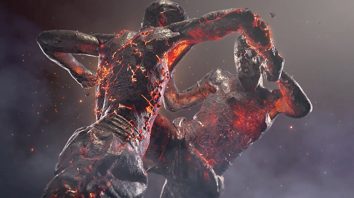 Alongside these scanned models, Statue also features complex Houdini simulations. The models land blows on each other, cracking open igneous husks to reveal the searing heat below. SBLabs ran a series of customised fragmentation and tessellation processes on the geometry with look development performed in Mantra.