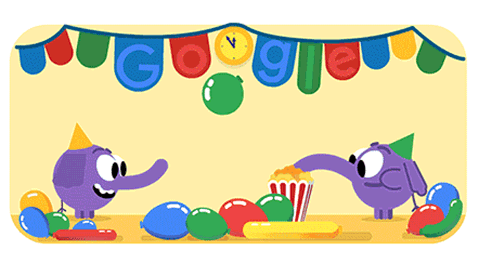 The animated doodle shows one of the baby elephants blowing balloons using its trunk, while the other tosses popcorns into its mouth. The doodle is adorned with festoons and a clock which is waiting to strike midnight and welcome the year 2019.