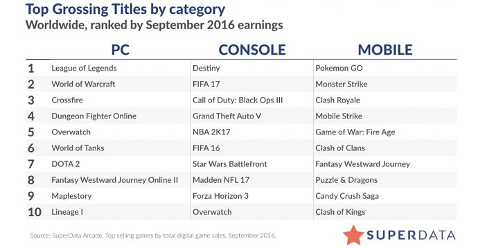 However, top console games managed to bag a good amount this time. Activision Blizzard’s first person shooter (FPS), Destiny managed to multiply its revenue by eight times in September in comparison to what it had in August 2016, all thanks to the expansion, ‘Rise of Iron’, says SuperData. The figures of Destiny went from $7.2 million in August to $59.1 million in September.