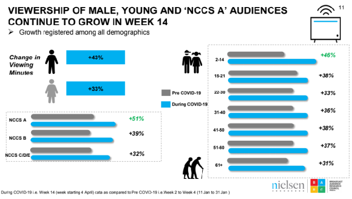 In the fourth edition of Crisis Consumption on TV and Smartphones released jointly by BARC India and Nielsen Media, total TV consumption grew by 38 per cent than the pre-COVID period (11 to 31 January 2020) to now standing at 1.2 Trillion minutes (from 4 April to 10 April).