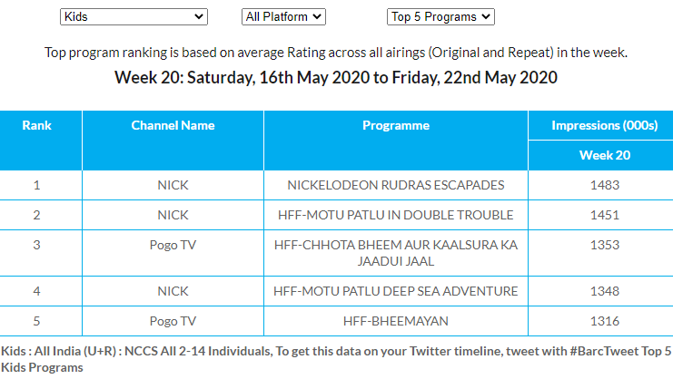 Rudra has dethroned Motu Patlu with his escapades in ‘Top 5 Programmes’, followed by Motu Patlu in Double Trouble, POGO’s Chhota Bheem aur Kaalsura ka Jadui Jaal, Motu Patlu Deep Sea Adventure and Bheemayan.