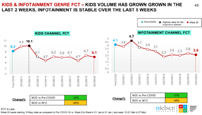 Overall AD volume on TV too has seen a rise in the last two weeks with 16 per cent growth in total FCT (Free Commercial Time) in week 20, including Kids and Infotainment. Kids channel FCT has grown by 30 per cent (From 4.7 lacs to 6.1 lacs) in the past two weeks with Infotainment remaining mostly stable.