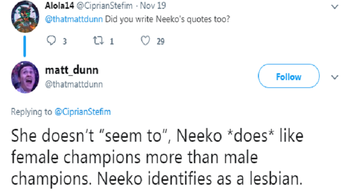 With the launch of Neeko, a curious chameleon who is able to take on other forms, a lot of assumptions and exclamations have been augmented like ‘she is gay, bi-curious’ but League of Legends developer Riot games senior narrative writer Matt Dunn responded to a fan on Twitter that “Neeko *does* like female champions more than male champions. Neeko identifies as a lesbian.”