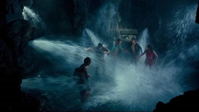 A lot of the puzzles that the kids travel through on their way into Parapata were a great hybrid between the practical shoot and VFX post work. The quicksand was a tank of water with crumbled cork which floated on top. The actors were able to float and swim around in the tank and then we went back in VFX and smoothed out some of the areas where the water showed through gaps in the cork and that kind of thing. The sluice duct which the kids slid down was actually a water slide that was built on set and the actors really did slide down. Isabela Moner was laughing or smiling in almost every take because she really enjoyed it. In VFX we replaced the slide with a stone texture and we added the pool of water and the jungle environment they landed into, but a lot of it was practical. The floor that tilted and sent the kids sliding down toward the spikes was another practical set which we reprojected onto geometry that allowed us to exaggerate the tilt motion and we also added the spikes at the bottom of the pit. When the kids are running through the forest as arrows are flying all around them, the arrows were all added in VFX.