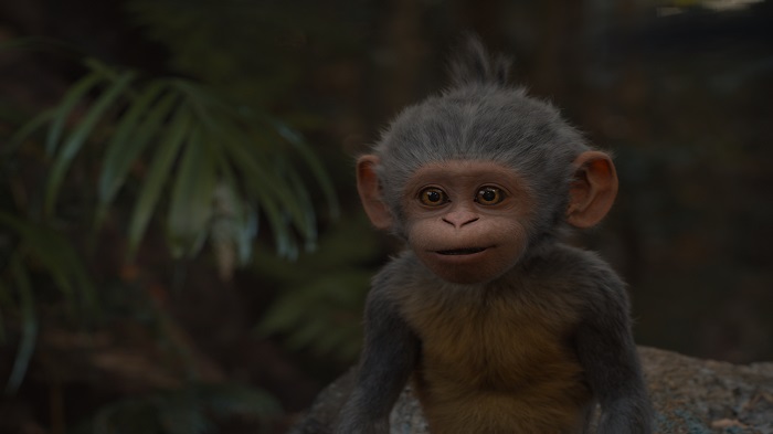 Boots was a hybrid of a Capuchin and a Spider Monkey, with a dash of the original cartoon design. We wanted to make sure he was realistic and would hold up in a live-action plate with real actors, but we also wanted him to preserve the essence of the original 2D cartoon and be cute and appealing to the audience. We basically built him completely photo-realistic and then went back and smoothed out some of the rough edges: fluffed his fur, saturated some of his colours, smoothed out his skin, etc until we found that balance. In the cartoon, Boots can be both very human and very monkey-like, so we knew we’d need him to perform both ways in the film. We customized his rig to be able to achieve both styles of animation.