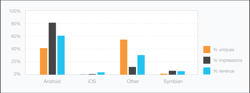 However, iOS clearly outpaces the competition for its ability to produce ad revenue on a fairly small market share, producing over 2 per cent of total revenue on just 0.5 per cent of total ad impressions.