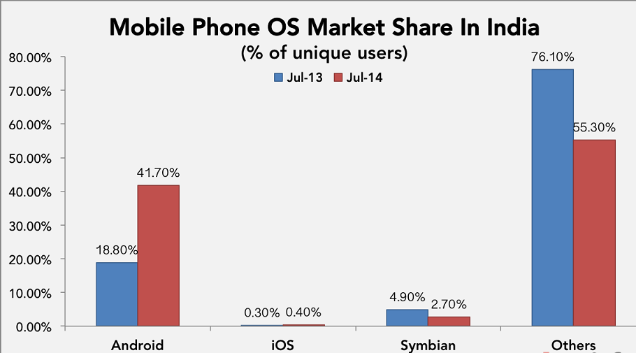 While India is still one of the global leaders in retaining older feature phone models, and the Symbian platform continues to hang on, it is significant to note that iOS struggles to make inroads.
