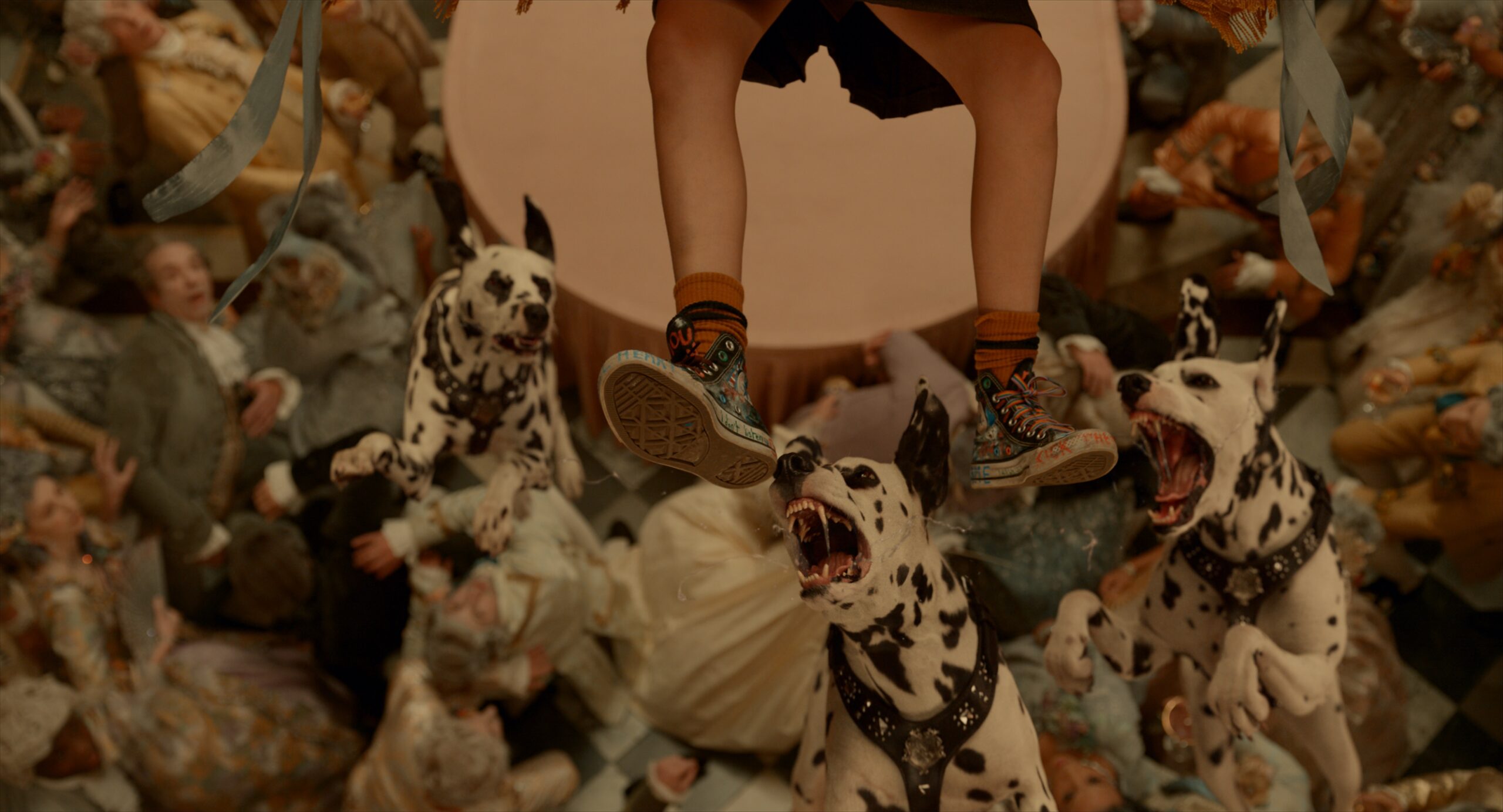 As well as the furry companions, MPC Film created the punk rock backdrop of the 1970’s London. By extensively researching the city’s history during this period, the team were able to recreate the landscape that saw some of the most significant changes in British society, such as women’s rights and the emerging punk rock culture. MPC’s Environment artists used 3D assets and digital matte paintings to transform present day London into the vibrant, fashion-forward streets of the 1970’s, as well as building a fully CG environment surrounding the Baroness’ Hellman Hall. One of the highlights of their work is a one and a half minute long shot featuring the iconic department store, Liberty of London, for which the compositing team had to seamlessly stitch together 7 different camera takes, using 2.5D and 3D set extensions to bridge between the various camera moves.
