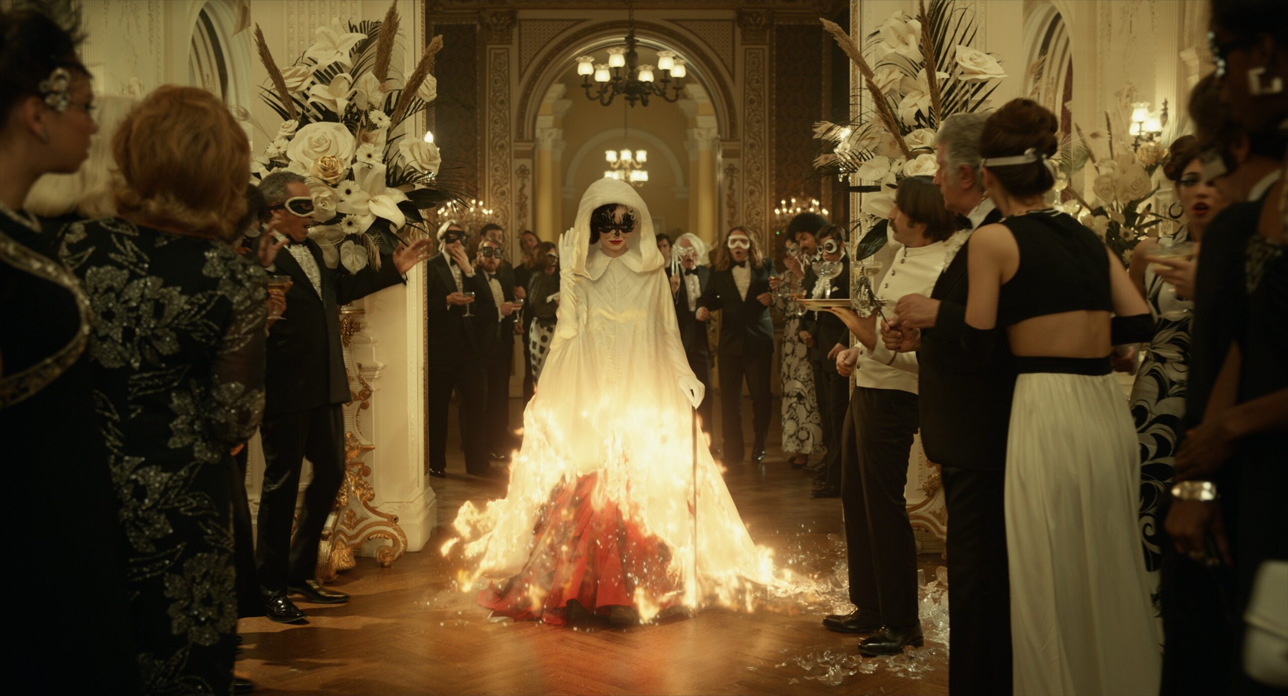 MPC Film also developed a number of Cruella’s notoriously fashionable outfits, the most notable piece being a dress made from over a thousand chrysalises. The team closely referenced concept art to accurately model the dormant insect pupa of a moth and then, using a proprietary crowd simulation tool, duplicate the extensive number of Chrysalis across the dress. It was essential that the Chrysalis was crafted to such detail that it would work in a close up shot where a moth hatches. Another highlight was a scene in which Cruella makes a spectacular entrance to a high society party in a white hooded cloak, which ignites into flames and drops to the floor revealing her iconic red dress.