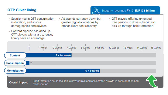 > In the monetisation front, penetration of subscription-based digital models will see a rise. OTT players are offering extended free periods to drive subscription pick up through habit formation.