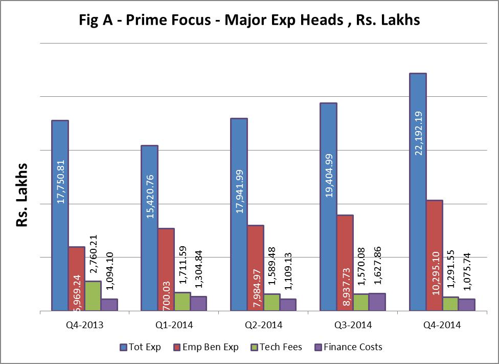 Fig A shows Prime Focus major Expense Heads (Exp Heads) in Rs. Lakhs – Total Expense (Tot Exp), Employee Benefit Expense (Emp Ben Exp), Technician’s Fees (Tech Fees), and Finance Costs.