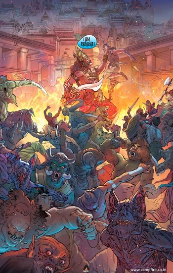 There are forces within Ayodhya that work secretly for Ravana, trying to breed rebellion within the kingdom, and sabotage the royal family through internal conflict. The main plot concerns the arrival of the 246-year old brahmarishi Vishwamitra who seeks to take young prince Rama to the dreaded Bhayanak-van to end the menace of the yaksi Taraka, who is Ravana’s emissary. The book ends with an epic battle in the haunted forest where Rama and Lakshman and Vishwamitra face the monstrous children of the giantess and finally, in a climactic showdown, Tataka herself. This is the plot of the graphic novel. The prose novel has much more detail and subplots of course but Sachin Nagar’s powerful art portrays the key events, characters and battle action brilliantly.