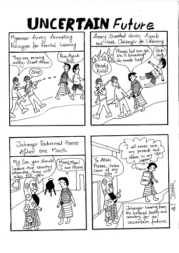 He was just nine years old when his family was forced to leave their home in Rakhine province in Myanmar, which led him create comics on how the Myanmar Army used to take Muslim youths for forced labour work; anyone who would disagree would be shot at point-blank. In such circumstances, many youths were forced to flee out of the country.