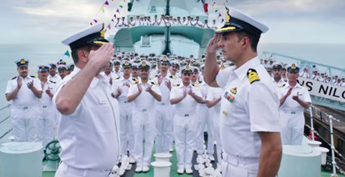 The naval ship, water, dockyard, crowd multiplication outside the court and background creation have been created using visual effects and CGI. Some of the VFX sequences look artificial and do not go in sync with the rest of the movie. For example, the firearms being shot from the ship, the overview of the naval ship approaching the dockyard, the smoke emerging out of the chimney from the ship, the background creation through the windows of the courtroom look quite out of place. However, the creation of the naval ship and crowd multiplication is a commendable effort. VFX studio Fluiidmask have worked on this film.