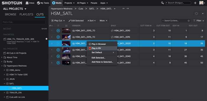 Play Cuts Anywhere: With one click, watch the full cut either in the browser or in the Shotgun RV desktop player. Powerful filtering tools control which shot versions show up in the cut, such as “latest,” “latest animation” or “latest approved.”