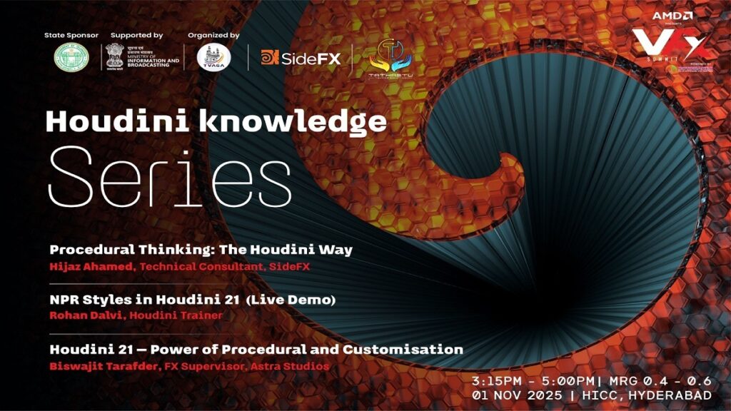 1.Procedural Thinking:The Houdini Way- This session is a deep dive into Houdini’s procedural mindset, exploring how node-based workflows empower artists to build complex effects like fluids, fire, and destruction, with non-destructive flexibility and smarter design systems. It will be conducted by SideFX technical consultant Hijaz Ahamed.