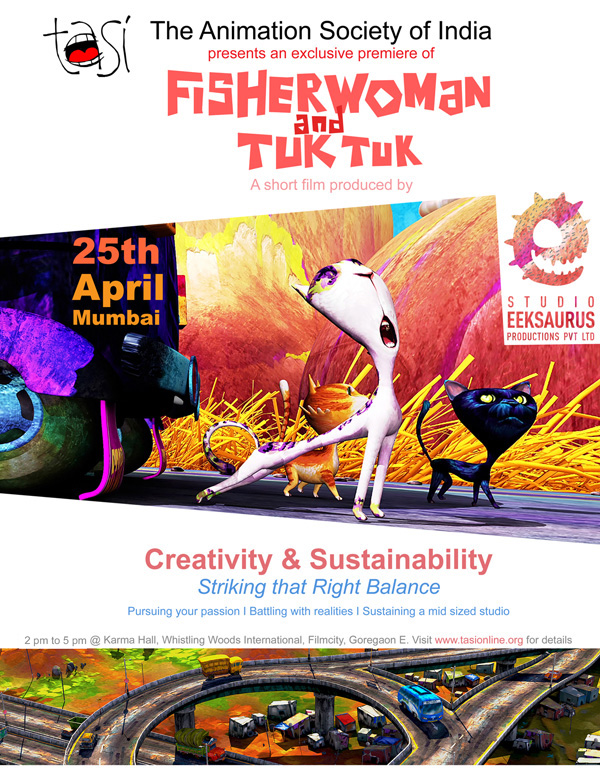The Animation Society of India is teaming up with Nilima and Suresh ‘Eeks’ Eriyat of Studio Eeksaurus for an exclusive screening of the latter’s latest short film ‘Fisherwoman and Tuk-Tuk’ at Karma Hall, Whistling Woods International, Filmcity on 25 April between 2:00 pm and 5:00 pm.