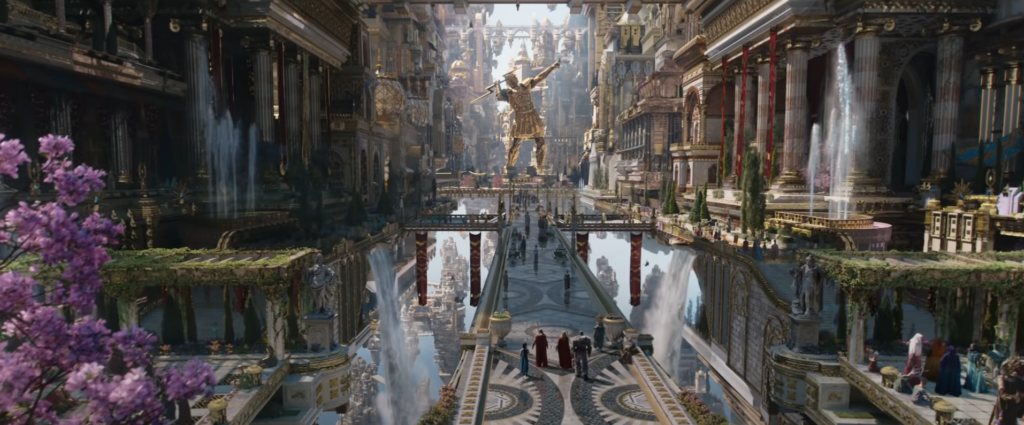 Talking of the Omnipotence, the CG work can be seen at its peak, where the whole gold city is built with complex structures and details. Two wonderfully crafted scenes that strike out the most in the film from a VFX perspective are one with the Zeus, and the other is a pre-climax scene where both the Thors enter the monochrome world of Gorr, and everything is black and white except the colourful lights of the weapons Stormbreaker and Mjolnir and Gorr’s eyes. Even though black and white, the scene is beautifully lit, casting perfect shadows. One of Gorr’s powers is to create shadow monsters using his Necrosword, and we can see the CG monsters all over the place.