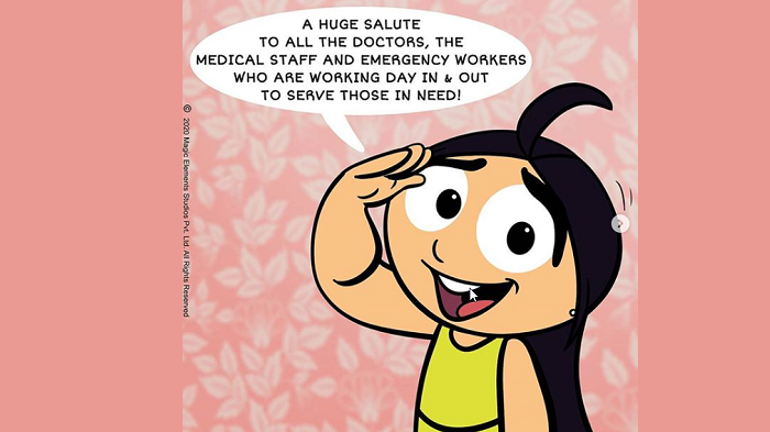 A few days before the Janta Curfew on 22 March, the studio did a post stating ‘(Better) Things to do at Home’ where Tibu does what she enjoys the most while being at home. Then during the lockdown a series of comics was shown with Tibu saluting and appreciating the role of all the doctors, health workers and emergency workers who are working round the clock to cure those infected.