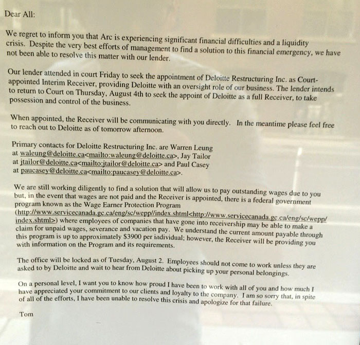 “We regret to inform you that Arc is experiencing significant financial difficulties and a liquidity crisis,” CEO, Tom Murray wrote to his staff in a letter. “Despite the very best efforts of management to find a solution to this financial emergency, we have not been able to resolve this matter with our lender.”