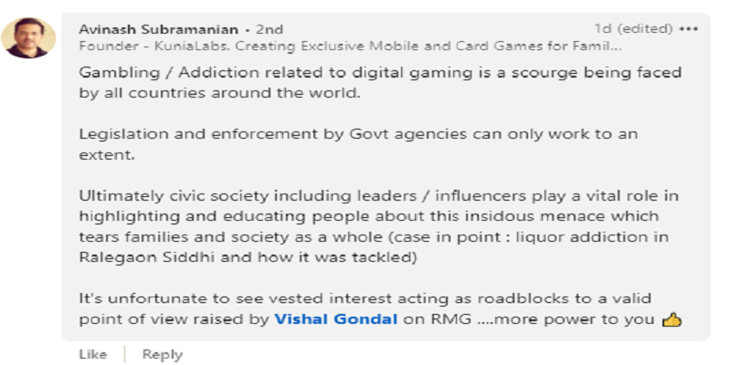 Not just Gondal, the entire gaming and esports fraternity are raising their voice against RMG . Few days back the Esports Federation of India rolled out a written piece to clarify how esports is different from fantasy sports or RMG. In Gondal’s recent post where he shared the data of the responses, many have shown their support.