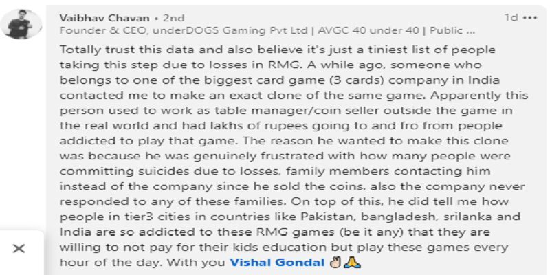 Raising voice against how real money games are causing financial loss to individuals, GOQii and nCore Games founder Vishal Gondal shared a tweet on 9 February which stated: “Rummy, Teen Patti, RMG Fantasy etc are not Skills games. They cause serious financial loss, addiction and death. Gambling is a poison pill served to the society in the garb of a skill game.. stop this!”