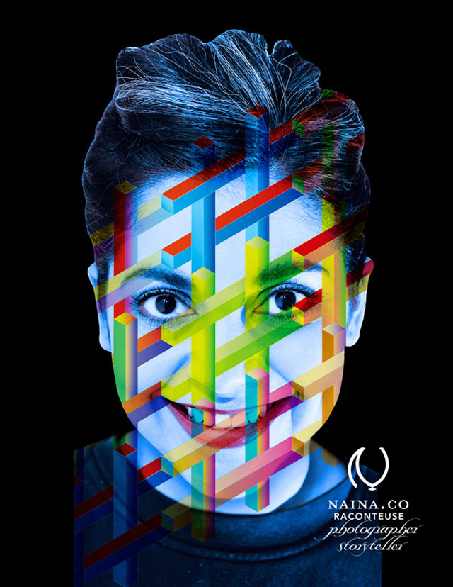 Working on her portrait Naina Redhu said, “All I could think of was this graphic artwork that I’ve been working on for a while. And how it perfectly fits who I am today. It’s a 3D pattern created in Adobe Illustrator, of multi-colored ‘hashtags’. Everything about the design and that project is representative of who I am today. It represents the real me with a professional life online as well as offline and how the two intertwine. I picked the particular portrait with the smile – even though I knew my teeth would turn out blue – because that’s always been my goal – to be happy doing whatever I’m doing.”