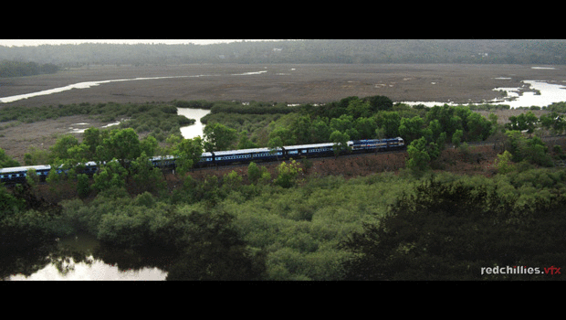 “Scenic shots like the train pulls in to a station in early morning; to transitions like the day turning into evening via mobile phone; to a transition where the train enters a tunnel in the evening and the headlight of the trains transforms into a beautiful full moon revealing the landscape at night where the train is passing over a bridge on the river are some more master shots created by redchillies.vfx using visual effects skills.” asserts Keitan.